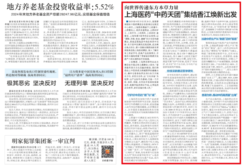 解放日报2025年9月30日专题版对上海医药参加首届香港国际中医药博览会进行了专题报道,全文如下。